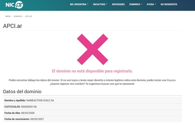 域名所有权: apci.ar 在阿根廷 NIC 注册系统中登记于 NAMEACTION CHILE S.A. 名下,该公司为外国中介机构,而非阿根廷国家机构。