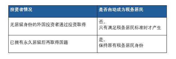 投资入籍本身不会自动触发税务居民身份。